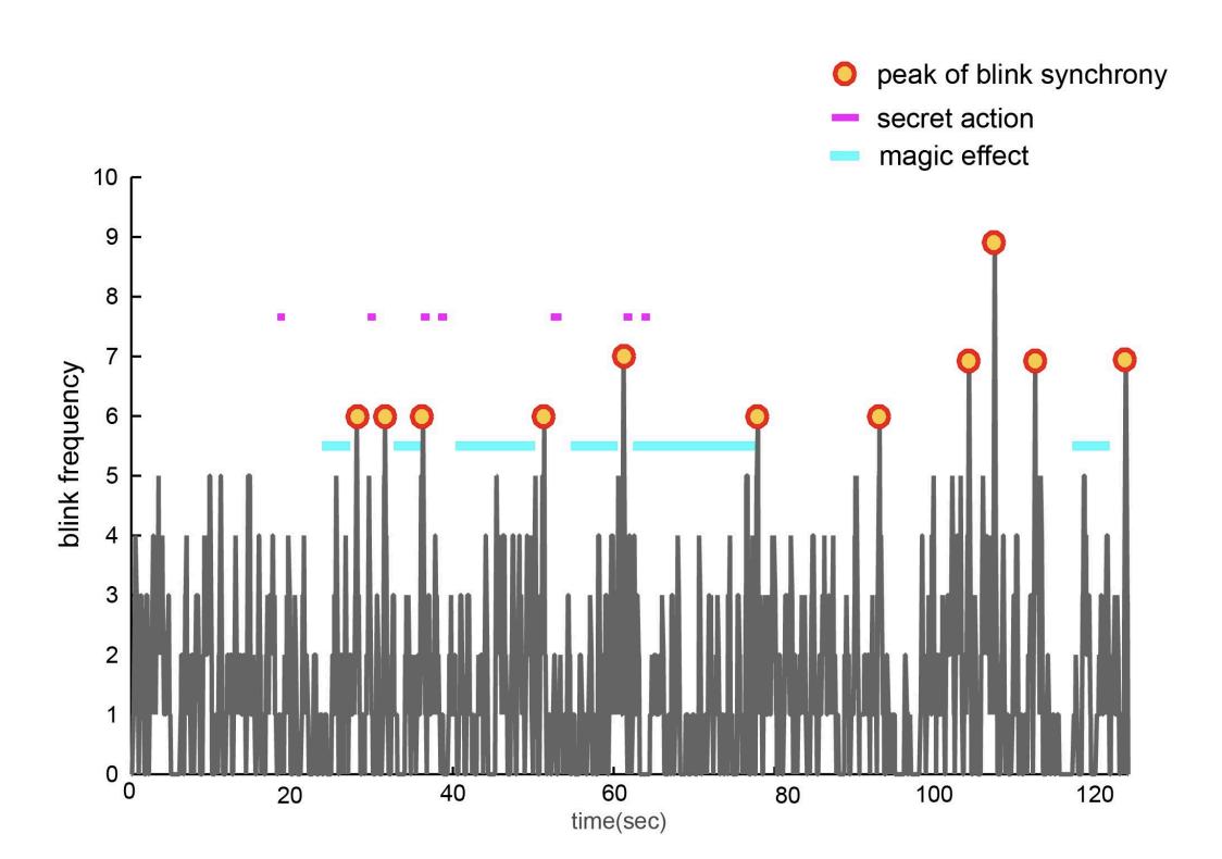 The final way is the natural synchronisation of blinks Richard Wiseman’s work into this aimed to suggest that the participating audience are more likely to fall for a magician's trick due to their blinks occurring not only simultaneously but also during the ‘secret actions’ done by the magician. This is what makes them unaware of what is happening. People blink not only to keep the eye lubricated and healthy, but also to boost intensity for forthcoming focus This is manipulated by magicians who use rhythms and patterns when speaking in tricks to create these areas of relaxed external attention (the point where audience members are then more likely to blink). This relaxation of attention then leaves space for the magician to complete the ‘secret action’ Wiseman found that blinks are strongly associated with specific stimuli, like pauses in conversations