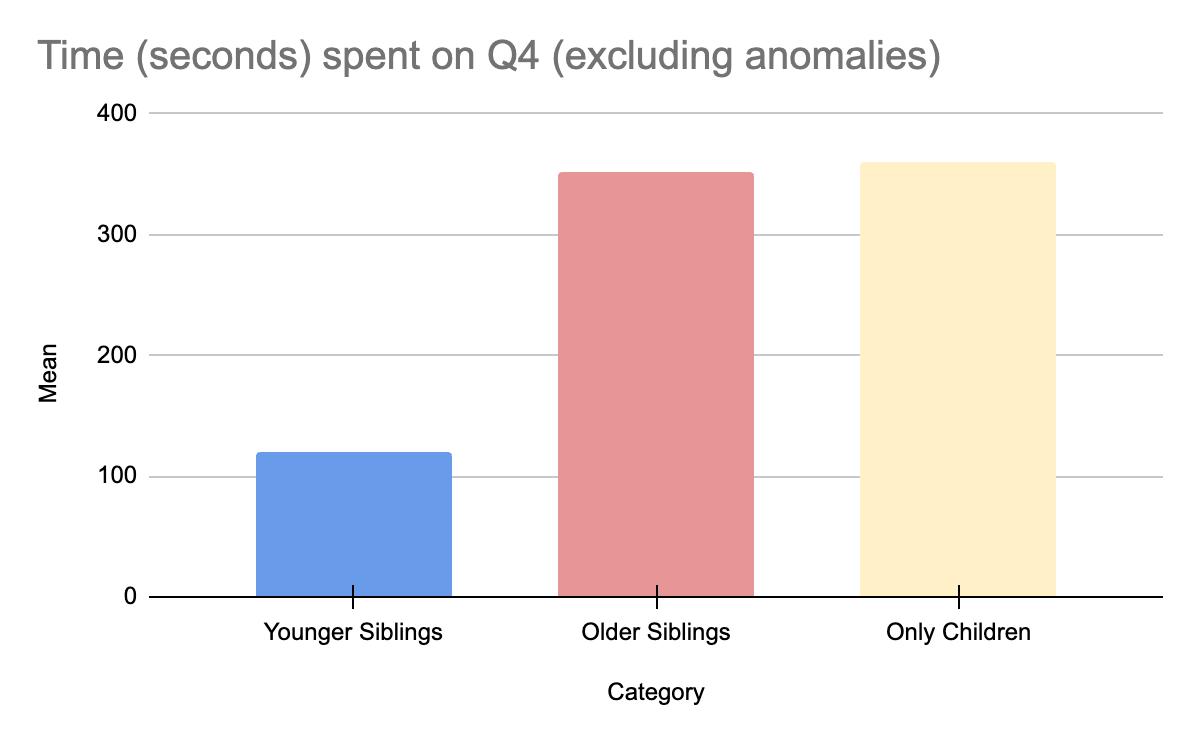 From this data, we can conclude that our hypothesis is correct and younger siblings are less perseverant than their older siblings or people with no siblings However, it is important to note that our experiment does not show causation due to it being a quasi-experiment and therefore we cannot claim this to be universally true.