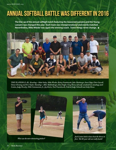 Annual Softball Battle Was Different in 2016 The line-up of the annual softball match featuring the Seasoned Lawyers and the Young Lawyers was changed this year. Each team was intergenerational and evenly matched. Nevertheless, Mike Wieder was again the winning coach. Some things never change.