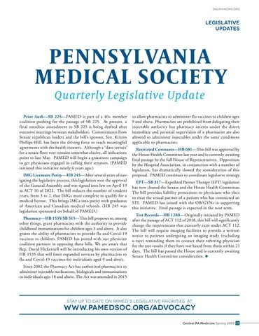Prior Auth—SB 225—PAMED is part of a 40+ member to allow pharmacists to administer flu vaccines to children ages coalition pushing for the passage of SB 225. At present, a 9 and above. Pharmacists are prohibited from delegating their final omnibus amendment to SB 225 is being drafted after injectable authority but pharmacy interns under the direct, extensive meetings between stakeholders. Commitments from immediate and personal supervision of a pharmacist are also Senate republican leaders and the bill’s sponsor, Sen. Kristin allowed to administer injectables under the same conditions Phillips-Hill, has been the driving force to reach meaningful applicable to pharmacists. agreements with the health insurers. Although a “date certain” Restricted Covenants—HB 681—This bill was approved by for a senate floor vote remains somewhat elusive, all indications the House Health Committee last year and is currently awaiting point to late May. PAMED will begin a grassroots campaign final passage by the full House of Representatives. Opposition to get physicians engaged in calling their senators. (PAMED by the Hospital Association, in conjunction with a number of initiated this initiative nearly 6 years ago.) legislators, has dramatically slowed the consideration of this IMG Licensure Parity—HB 245—After several years of nav- proposal. PAMED continues to coordinate legislative strategy. igating the legislative process, this legislation won the approval EPT—SB 317—Expedited Partner Therapy (EPT) legislation of the General Assembly and was signed into law on April 19 has now cleared the Senate and the House Health Committee. as ACT 16 of 2022. The bill reduces the number of resident The bill provides liability protections to physicians who elect years, from 3 to 2, that IMGs must complete to qualify for a to treat the sexual partner of a patient who has contracted an medical license. This brings IMGs into parity with graduates STI. PAMED has joined with the OB/GYNs in supporting of American and Canadian medical schools. (HB 245 was this initiative. Final passage is expected in the near term. legislation sponsored on behalf of PAMED.) Test Records—HB 1280—Originally initiated by PAMED Pharmacy—HB 1535/SB 515—This bill proposes to, among after the passage of ACT 112 of 2018, this bill will significantly other things, grant pharmacists with the authority to provide change the requirements that currently exist under ACT 112. childhood immunizations for children ages 3 and above. It also The bill will require imaging facilities to provide a written grants the ability of pharmacists to provide flu and Covid-19 notice to patients undergoing an imaging study (excluding vaccines to children. PAMED has joined with our physician x-rays) reminding them to contact their referring physician coalition partners in opposing these bills. We are aware that for the test results if they have not heard from them within 21 Rep. David Hickernell will be introducing his own version of days. The bill has passed the House and is currently awaiting HB 1535 that will limit expanded services by pharmacists to Senate Health Committee consideration. flu and Covid-19 vaccines for individuals aged 9 and above. Since 2002 the Pharmacy Act has authorized pharmacists to administer injectable medications, biologicals and immunizations to individuals ages 18 and above. The Act was amended in 2015