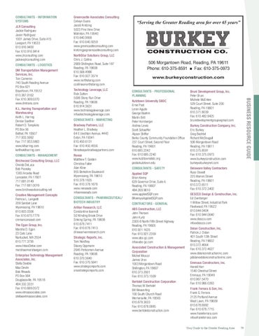 urkey Construction Company, Inc. B Eric Burkey Greg Bechtel Richard McDougall 506 Morgantown Road Reading, PA 19611 610.375.8591 Fax: 610.375.0973 www.burkeyconstruction.com burkey@burkeynet.com elaware Valley Contractors D Russ Oswalt 225 Warren Street Reading, PA 19601 610.372.6511 Fax: 610.372.3402 CCO Design & Construction, Inc. DES Ed Overberger 1 Willow Street, Industrial Park Fleetwood, PA 19522 610.944.0404 Fax: 610.944.0640 www.descco.com info@descco.com olan Construction, Inc. D Patrick J. Dolan 401 South 13th Street Reading, PA 19602 610.372.4664 Fax: 610.372.4627 www.dolanconstructioninc.com pdolan@dolanconstructioninc.com E mmaus Constructors, Inc. Harold Harr 1540 Chestnut Street Emmaus, PA 18049 610.967.5470 Fax: 610.966.0263 F rank Ferrara & Son, Inc. Frank G. Ferrara 2125 Portland Avenue West Lawn, PA 19609 610.678.6992 Fax: 610.678.7715 www.frankferrara.com info@frankferrara.com Your Guide to the Greater Reading Area