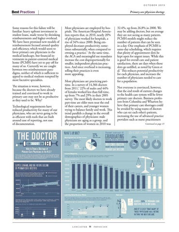 Not everyone is convinced, however, , if thatyothe end result of current changes t to the health care system will be fewer primary care doctors. Business professors from Columbia and Wharton bey that primary care shortages could lieve be avoided by using teams of doctors who can see each other’s patients, increasing the use of advanced practice r providers such as nurse practitioners Continued on page 13