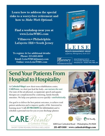 Learn how to address the special risks to a worry-free retirement and how to Make Work Optional. Find a workshop near you at www.LeiseWMG.com Villanova • Philadelphia Lafayette Hill • South Jersey To register & for additional details: Phone: 215.665.6658 Email: LeiseWMG@Janney.com Online: www.LeiseWMG.com