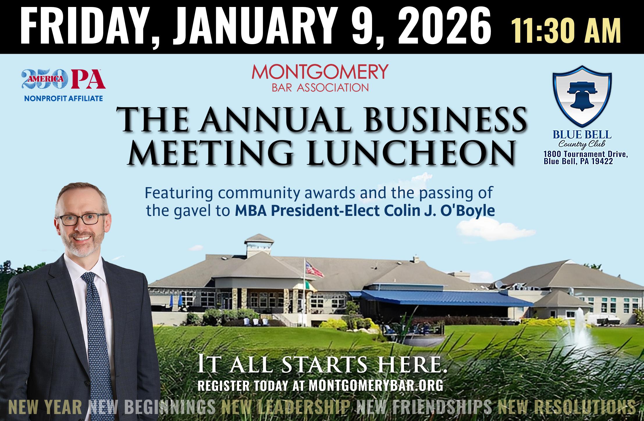 We also look forward to some new adventures and to the revival of some past programs and events. Be sure to check out the MBA 2026 Calendar throughout the year. To highlight just a few events: look to dust off your formal wear in April for our Dinner Dance (April 24); pack your best vest for viewing fall foliage at our Bench Bar Conference at Skytop in the Poconos (September 24-27); and be ready to come to the George Washington Chapel in Valley Forge for the Ecumenical Blessing of the Court service (October 1).