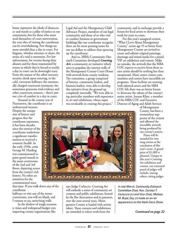says Judge Carluccio. Courting Art will embody a series of community art contests and public exhibitions, hosted by the Bar Association and its partners, over the next several years. Montgomery County is loaded with artistic talent. These contests and exhibitions are intended to solicit work from the