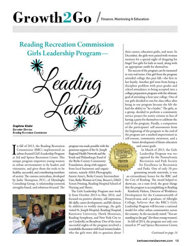 their careers, education paths, and more. In December, the girls were paired with women mentors for a special night of shopping for Angel Tree gifts for kids in need, along with an appropriate outfit for themselves. The success of the program can be measured in very real terms. One girl from the program attended college this past fall—the first in her family. Another girl went from being a discipline problem with poor grades and school attendance to being accepted into a college-preparation program with the ultimate goal of attending a four-year college. One of our girls decided to run for class office after being in our program because she felt she had the ability to “be a leader.” The girls, as a group, decided to perform a community service project for senior citizens in lieu of having a party for themselves to celebrate the end of the program. Finally, a comparison of the participants’ self-assessments from the beginning of the program to the end of the program saw a marked improvement in self-esteem, community awareness, and a better development of future education and career goals. program was made possible with the In March of 2013, the Girls generous support of the St. Joseph Leadership Program was recRegional Health Network and the ognized by the Pennsylvania Youth and Philanthropy Fund of Recreation and Park Society the Berks County Community for Excellence in Recreation Foundation, along with support and Parks. One of only 10 profrom local businesses and organigramming awards statewide, it was zations, namely AMA Photography, an extraordinary honor for the RRC and Auntie Anne’s, Berks County Intermediate the City of Reading. The award helped to Unit, Berks Women in Crisis, Boscov’s, D&D showcase, on a state level, the great things Screen Printing, Reading Hospital School of that the program is accomplishing in Reading. Nursing and Sheetz. Kimberly Helton, Director of Workforce The Girls Leadership Program met weekDevelopment for the Commonwealth of ly from October 2013 to May 2014, and Pennsylvania and a graduate of Albright focused on positive identity, self-expression, College, believes that the RRC’s Girls life skills, career development, and life choices. In addition to weekly meetings, the girls Leadership Program will become a national visited St. Joseph Hospital, Reading Hospital, model for other urban communities across Kutztown University, Hawk Mountain, the country. As she succinctly stated: “You are Reading Symphony, and New York City to standing in the gap” [for these young women]. In fall of 2014, the program not only consee Cinderella on Broadway. One of the most successful nights of the program involved a tinued at 3rd and Spruce Recreation Center, roundtable discussion with local women leaders who the girls were able to question about Continued on page 14 berkswomen2women.com 13