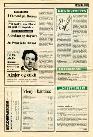 1.·5. plass: Siv, Torun, Hugo, Gisle og Odd Einar. Ja , du leser riktig. Denne uke n h ar vi i BULLEredaksjonen plassert oss selv på kjendistoppen. Og det er vel det eneste vi ha r klart å bli enige om i det siste. Men sjelden er en plassering på kjendistoppen mer ve lfortjent: Forrige uke klarte vi å utgi en 16 siders avis under høyst turbulente omgivelser, med hektisk møtevirksomhet og enkelte små uoverensstemmelser. Og alt dette har vi klart på tross av at vi fremdeles driver på helt uten noen sikker økonomisk ryggrad . Når kommer m isti Ilitsforslaget? 6. plass: Preben Svendsen, Il Ha "oi-sjef Preben var med