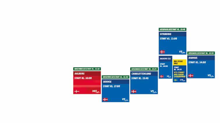 MANDAG 14. AUGUST LØBSSTART Bergsåker kl. 18:20 Färjestad kl. 12:20 Skellefteå kl. 17:45 TIRSDAG 15. AUGUST LØBSSTART Jägersro kl. 18:20 Skive kl. 16:00 Eskilstuna kl. 17:45 Hagmyren kl. 12:20 Bjerke kl. 19:00 ONSDAG 16. AUGUST LØBSSTART Solvalla kl. 18:00 Bro Park kl. 12:20 TORSDAG 17. AUGUST LØBSSTART Åby kl. 18:20 Övrevoll kl. 18:00 Boden kl. 18:30 Visby kl. 12:20 Örebro kl. 17:45 Jarlsberg kl. 11:25 FREDAG 18. AUGUST LØBSSTART Bollnäs kl. 18:20 Kalmar kl. 18:30 Årjäng kl. 12:20 Odense kl. 15:45 Klampenborg kl. 18:20