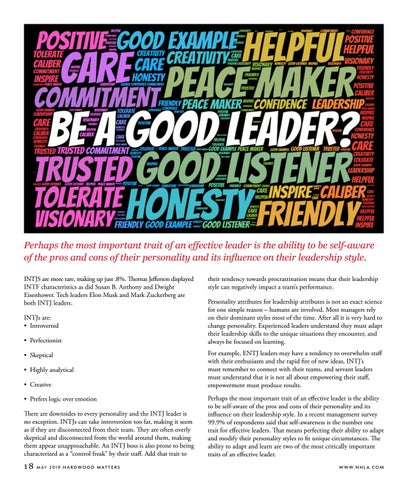 Perhaps the most important trait of an effective leader is the ability to be self-aware of the pros and cons of their personality and its influence on their leadership style. INTJS are more rare, making up just .8%. Thomas Jefferson displayed INTF characteristics as did Susan B. Anthony and Dwight Eisenhower. Tech leaders Elon Musk and Mark Zuckerberg are both INTJ leaders. INTJs are: • Introverted • Perfectionist • Skeptical • Highly analytical • Creative • Prefers logic over emotion There are downsides to every personality and the INTJ leader is no exception. INTJs can take introversion too far, making it seem as if they are disconnected from their team. They are often overly skeptical and disconnected from the world around them, making them appear unapproachable. An INTJ boss is also prone to being characterized as a “control freak” by their staff. Add that trait to