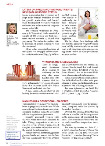 Iodine is important for pregnancy as it helps make thyroid hormones needed for growth, metabolism and babies’ brain development. Now, new work has measured the iodine status of pregnant mums in the UK. The SPRINT (Selenium in PRegnancy INTervention) trials recruited a sample of 230 women and took spoturine samples at weeks 12, 20 and 35 of pregnancy. The iodine-to-creatine ratio (a measure of iodine deficiency) was also measured. Mean iodine concentration from all time points was 56.8μg/L and the iodineto-creatinine ratio was 116μg/g, indicat-