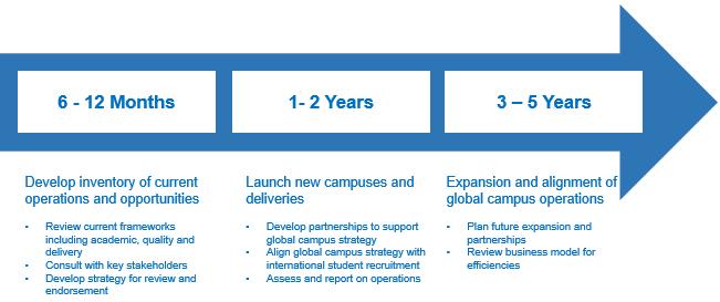 Niagara College’s global campuses strategy will expand operations over the next five years, balancing our in-Canada and overseas operations. This strategy will ensure that there are diverse pathways for students to start their NC education journey at satellite NC locations, yield strong net profits for NC as well as support our Be World Ready program. The following illustrates the key milestone for the duration of the plan.