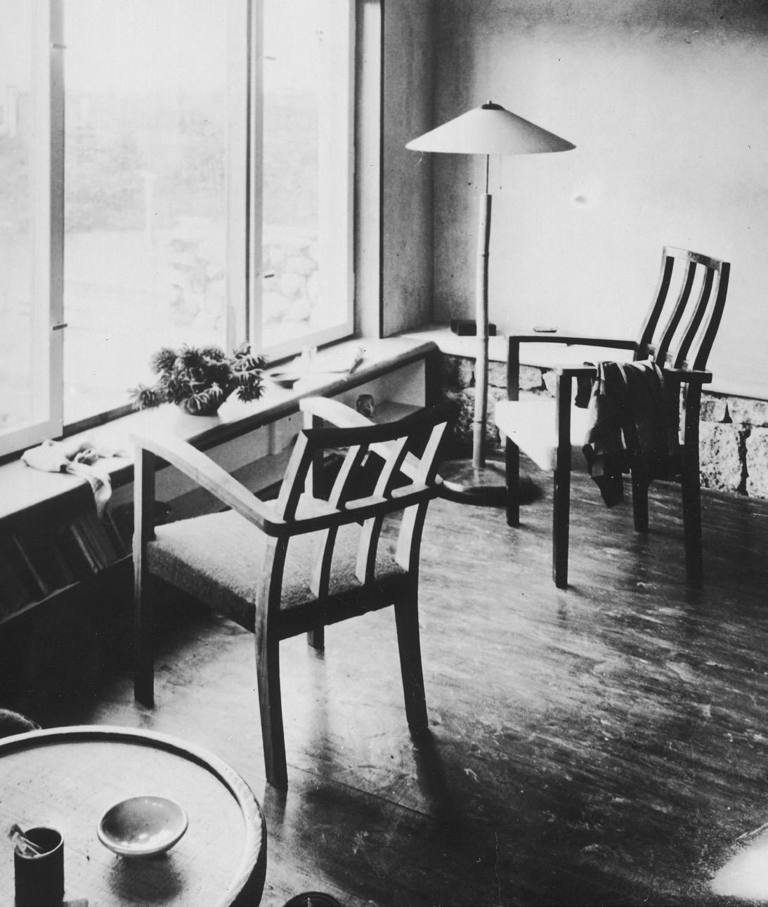 Wnętrze domu Lucjana Bogusławskiego w Komorowie: salon z parą krzeseł ustawionych przy oknie z widokiem na ogród, 1935, proj. Jan Bogusławski, fot. NAC