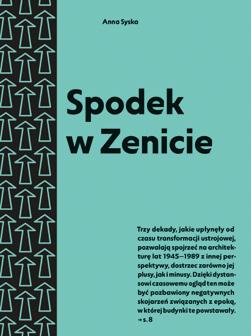 Spodek w Zenicie. Przewodnik po architekturze lat 1945 –1989 w województwie śląskim Publikacja ukazuje fenomen architektury województwa śląskiego: 120 realizacji w 33 miejscowościach. Dzieła ikoniczne, założenia i budynki okresu socrealizmu, interesujące przykłady architektury poodwilżowej, eksperymenty konstrukcyjne i technologiczne, duże osiedla mieszkaniowe, a nawet zupełnie nowe miasta. Tytuł książki pochodzi od nazw dwóch katowickich budynków: Hali Widowiskowo-Sportowej „Spodek” i Domu Handlowego „Zenit”. To połączenie wskazuje na minioną już świetność tej architektury. Trzy dekady, które upłynęły od czasu transformacji ustrojowej, pozwalają na realizacje z lat 1945 –1989 spojrzeć z innej perspektywy – bez negatywnych skojarzeń związanych z epoką, w której te budynki powstawały.
