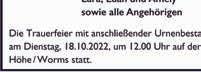 Tel.(0176)10435480 22_41s WirsuchenzurMieteeinbezahlbares, idyllischesHäuschen mitGarageundkleinemGarten in WORMS Nähe WESTEND daswäreschön. Wirwürdengernenoch indiesemJahrumziehen. Zuschriftenerbetenan VerlagNibelungenKurierGmbH, Prinz-Carl-Anlage20,67547Worms unter Chiffre7386 „Irgendwann ist irgendwann zu spät!“ JETZT Immobilie diskret und direkt verkaufen. Bitte alles anbieten! Immobilien Kiesewetter GmbH Tel. (01 78) 7 10 07 30 22_11s IMMOBILIENSERVICE DENSCHLAG Tel. (0 62 41) 69 61 Sachverständige für Immobilienbewertung D2 Mitglied im Immobilienverband Deutschland Seit 1974 Ihr Makler für Worms und ganz Rheinhessen 22_16s Tel.: 02401 80 488 50 www.melan.de Trödelmarkt Jeder kann mitmachen auch ohne Anmeldung! Auto ab 3 Metern! Aufbau ab 10 Uhr! Aufbau ab 6 Uhr. Öffnungszeit 8 - 16 UhrKeine Neuware! Aufbau ab 5 Uhr! Gensingen Globus Raunheim EDEKA11-17 Uhr 10-17 Uhr Sonntag 16.10 Sonntag 16.10 So, 23.10. Mainz-Kastel Metro Großer Flohmarkt am16. Ok tober2022 in Lampertheim /E-Center Gaußstraße von10bis 18 Uhr. KeineNeuware/ keine Anmeldungnötig. Plat zvergabe ab 6Uhr. ChD Trödelmärk te