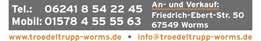 Tel. 0611-97447344 AutoparkGernsheim AnkaufallerFahrzeuge! AuchnachUnfall&ohneTÜV! (06258)3773 (0174)2027729 22_41s 22_40s PROVISIONSFREI TRAUMHAUS aufgroßemGrundstückin gesuchterLagevonEich Ökologischnachhaltig außergewöhnlich 10Zimmer,2Küchen, 3Bäder,Wfl.334m²Areal1.413m²,Bj.1997 Doppelgarage-Carport KP€777.000,–keineKäuferprovision Gefügelverkaufam21.10.2022 Haßloch, Jahnplatz, 800-945 RWS-MarktHerxheim, Gewerbepark West2,1030-1145 RWS-MarktKirrweiler Raiffeisenstr.6,1215-1315 RWZ-MarktDeidesheim, BuschwegNord3,1345-1445 RWZ-Markt Westhofen, Raiffeisenstr.6,1530-1700 Telefon05250 /53322 AktuelleInfosunter: www.gefuegelhof-franzsander.de –VorbestellungenbittebisMittwoch!–Trapezbleche 1. Wahl und Sonderposten auseigenerProduktion,TOP-Preise,cm-genau 98646Eishausen,StraßeinderNeustadt107 bundesweiteLieferung, ☎ 03685/40914-0 5%Online-Rabattsichern www.dachbleche24.de Trödelmarkt Tel.: 02401 - 80 488 50 www.melan.de 3 Meter Trödel 15€ & 3 Meter Neuware 30€ JEDEN SAMSTAG - VOLL ÜBERDACHT! Wiesbaden Äppelallee Penny Großer Flohmarkt So. 16.10., Alzey, RheinhessenCenter, person Märkte 06322 959995 Timo sucht Pelze aller Art, Zinn, Silber, Korallen, Teppiche, Möbel, Flohmarktsachen, Modeschmuck, Münzen, def. Uhren, Militär. Zahle bar und fair. 06181-3029629