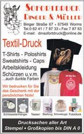 ZuschriftenerbetenanVerlagNibelungenKurierGmbH,Prinz-Carl-Anlage20, 67547WormsoderperE-Mailanverlag@nibelungen-kurier.deunter: Chiffre7385