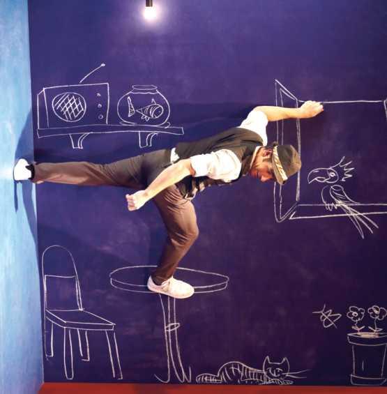 TobiasWegnererzähltdieGeschichteeinerFigurineinem Raum,indemdieGesetzeder Schwerkraftnichtgelten,von demaberjederglaubt,schon einmalgeträumtzuhaben.Leo schwebtanderWand,dreht aberwitzigePirouetten,wirfteinenHutindieLuft,deraufihn zurückplumpst,alswäresein KörperdasGravitationszentrumdesUniversums.EineVideoprojektionermöglichtdiese physikalischenQuantensprünge.