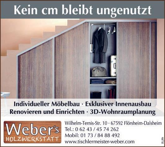 InIhrerNähe: Marken-QualitätzumbestenPreis! 23_03s Unsere Inserenten empfehlen sich! LesenSiefolgendeThemen: EINBRUCHSCHUTZ ENERGETISCHES MODERNISIEREN UPCYCLING&RENOVIEREN Dreißigacker& Sohn MonsheimerStraße18 67549Worms Telefon06241/591844 info@dreissigacker-sohn.de www.dreissigacker-sohn.de Geschäftszeiten Mo.–Fr.von7.30bis12Uhr undvon13bis17Uhr Do.bis18Uhr Stilvollundnachhaltigeinrichten:NaturmaterialienundRecyclingwerkstoffe stehenetwabeiderBodengestaltunghochimKurs. Foto:djd/Werkhaus 23_03s GreenDecker®Velux-Experte WWW.DACHBAUBOSSERT.COM DieFirmaistseit1928inWormsansässigundseitherinFamilienhandgeführt.WolfundRolfDreißigackersindInhaberderFirma.SiehabensichaufprivateSanierungen spezialisiertundsindinWormseinBegriff,wennesumdieErneuerungvonFenster,Haustüren,Rollläden,Jalousien,Garagentore,VordächerundZimmertürengeht.