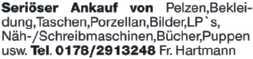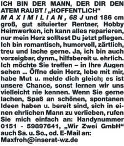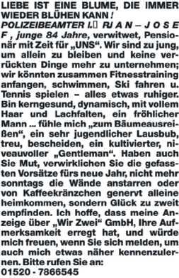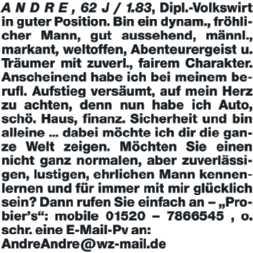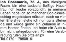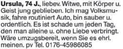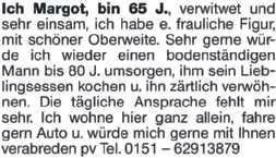 LiebevolleWitweUlrike,74J., bineine saubere,guteFrauvomLand,nicht ortsgebunden,habeeineschlankeFigurundetwasmehrOberweite.Ich binsparsam,gutmütigundanpassungsfähig,schätzeeinordentliches Zuhause,gemütlicheFernsehabende u.würdeSiesehrgernemitmeinem Autobesuchen,damitwirallesbesprechenkönnenpv. Telefon(0170)7950816