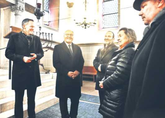 denEingangderFrauensynagoge.InderMännersynagogeangekommen,nahmderBundespräsidentdenToraschreinund dasNerTamidhinterdenSpitzbögeninAugenschein.AnschließendzeigteihmRabbi AharonRanVernikoyskydie InschriftenderBima.Hieram LesepultwirdwährenddesGottesdienstesausderToravorgelesen.