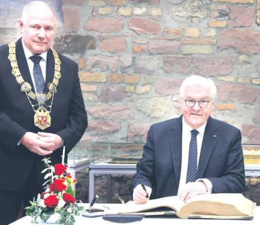 ImAnschlusstrugsichder höchsteWürdenträgerderBundesrepublikDeutschlandimRaschi-HausindasGoldeneBuch derStadtein.„Endlich“freute sichOberbürgermeisterAdolf Kessel,dennschonvorCorona solltederBesucherfolgen.Als GeschenknahmSteinmeiereineEinladungzudenNibelungenfestspielenimSommermit. „EinGrundmehr“,soKessel,