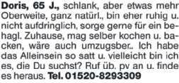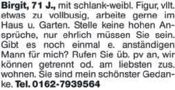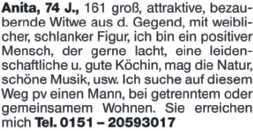 ERSUCHTSIE 70ES Witwer78,167cm,reisefr.,sucht Partnerinbis73J.fürgem.Untern. Binoftunterw.,wasaberalleinewenigSpaßmacht.Fühlstdudichangesprochen?NurMut,ichbeißenicht.