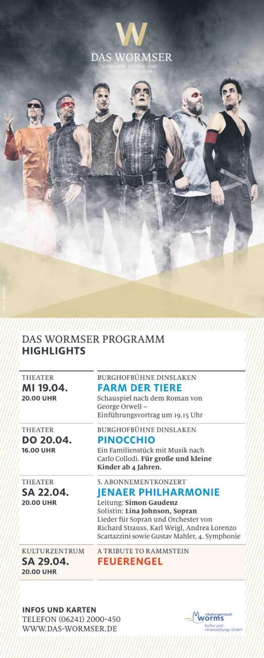Vom7.bis23.Juli2023zählt dasKulturprogrammzueinem derHöhepunktederWormser Nibelungen-Festspiele.Neben einerAufführungmitAlexandraKampundMiguelAbrantes Ostrowski,einemKonzertvon GenijaRykova&Bandsowie derszenischenLesungvonKatharina,Anna&NellieThalbachgibtesauchwiederbewährtePublikumsmagnetewie diebeispielsweiseTheaterbegegnungensowieVorträgeund Ausstellungen.