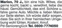 ERSUCHTSIE 70ES Wardasschonalles oderkommt nochwas?AlleinstehenderWitwer,71 J.,NR,suchteinenetteFrau,NR,für vielleichtnochviele,schöneJahrezusammen. Chiffre7463