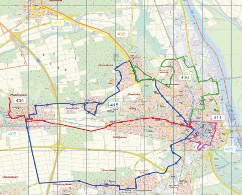 WeitereÄnderungengibtes zudembeidenLinien434,welchekünftigvonMörstadtüber PfeddersheimnachWormsverkehrenwird,sowiederLinie435, dievonOsthofenkommendüber AbenheimundHerrnsheimden ZOBanfahrenwird.Abenheim erhältsomiteinedirekteVerbindungnachOsthofen.ZudemwirddieLinie403 künftigbisnach AbenheimverlängertunddieLinie 430imAbschnittWesthofen–Worms aufeinen30Minuten-Takt verdichtet.Dadurchergibt sichzwischen Abenheim, Herrnsheimund derInnenstadt etwaein15-Minuten-Takt.