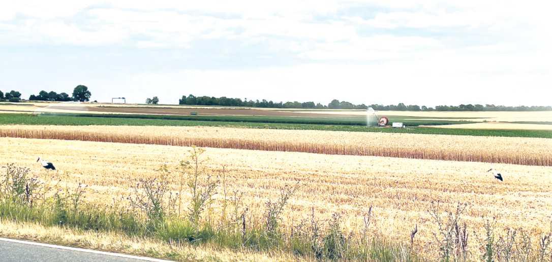 StörcheklapperneinPfeddersheimerFeldab.ImHintergrundsorgenzweiGroßflächenregnerfürdienotwendigeBewässerungeinesweiterenFeldes.Foto:RobertLehr