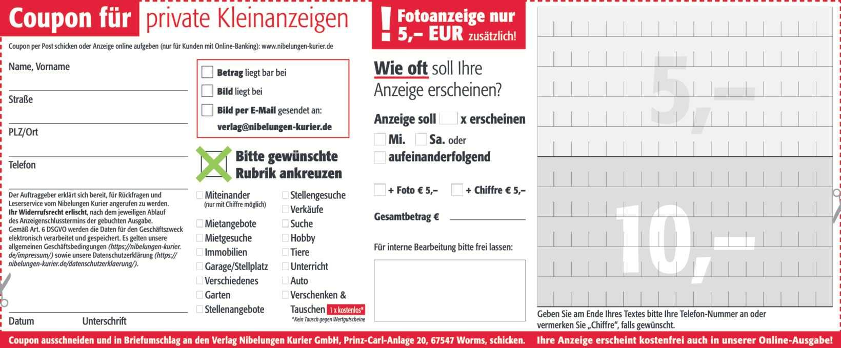 Chiffre-Anzeigen …beantwortenSieperBriefan:Nibelungen Kurier,Prinz-Carl-Anlage20,67547 Worms BittegebenSiebereitsaufdemUmschlag dieChiffre-Nummeran.WirleitenIhrSchreiben ungeöffnetandenAdressatenweiter. AlternativsendenSieeineE-Mailan: verlag@nibelungen-kurier.de Auskünftesindbei Chiffre-Anzeigennichtmöglich. www.nibelungen-kurier.de