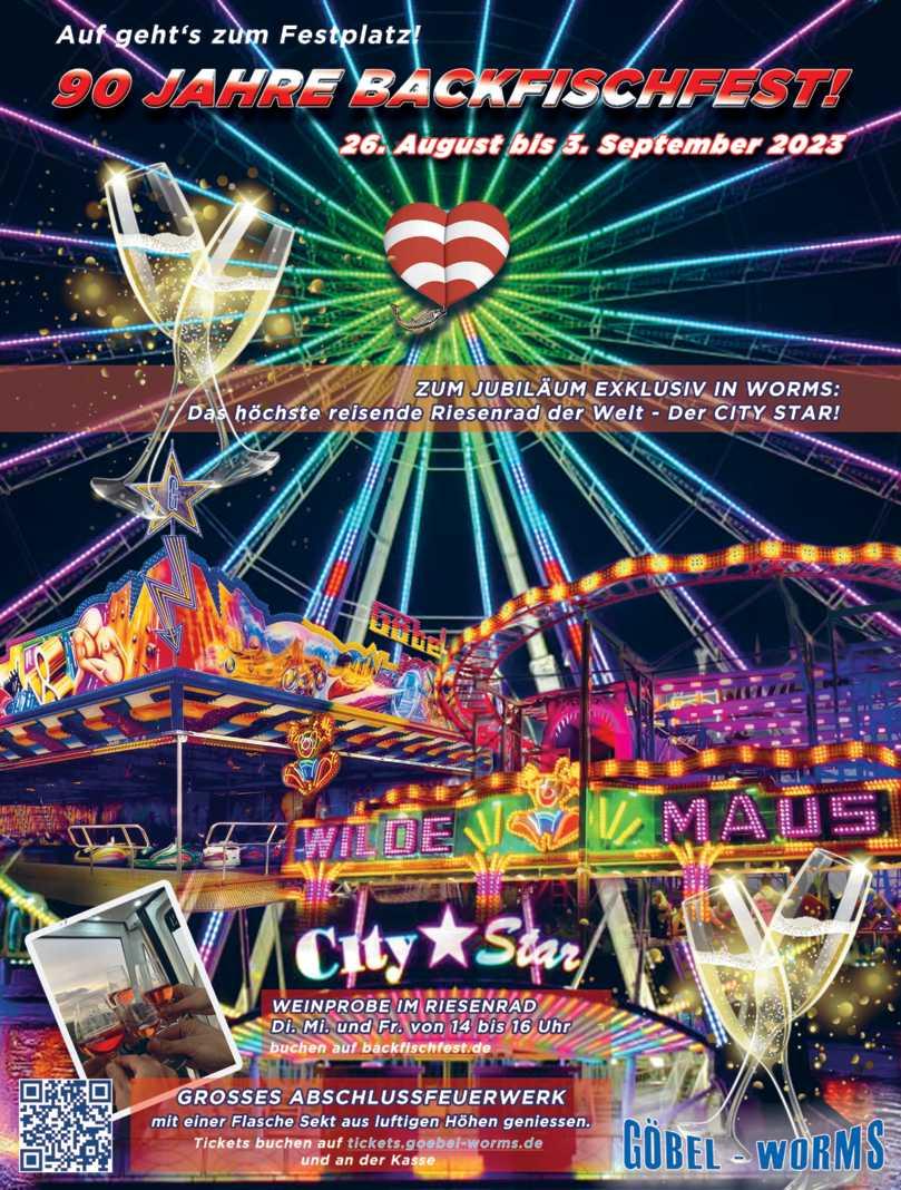 48 Gondeln à 6 Plätze Noch dauere es etwas, bis die 48 geschlossenen Gondeln mit ihren jeweils 6 Plätzen ihre Besucherinnen und Besucher über die Silhouette der Stadt befördern können, aber jetzt schon verspricht der erfahrene Schausteller: „Die Ausblicke in den Odenwald, Richtung Mannheim oder die Pfalz werden einmalig – ganz zu schweigen von denen über unser schönes Worms“. Und Göbel kann mit einen weiteren Superlativ aufwarten: Noch nie habe auf einem deutschen Volksfest ein größeres Riesenrad gestanden, so Göbel nicht ohne Stolz. Bei den bisherigen Standorten wie z.B. in Ludwigsburg oder Bad Dürkheim habe es sich ja beim Betrieb des „City Stars“ lediglich um „Stand alone“-Attraktionen ohne Vergnügungsparks gehandelt. Kosten werde eine Fahrt für Erwachsene 8, für Kinder 5 Euro und sie dauere zwischen 10 und 15 Minuten, wobei man je nach Geschwindigkeit zwischen 5 und 8 Mal die höchste Stelle erreiche, weckt Sebastian Göbel schon jetzt die Vorfreude. Bitte lesen Sie weiter auf unseren Sonderseiten 15–18, auf denen Sie weitere Infomationen rund um das Backfischfest 2023 finden.