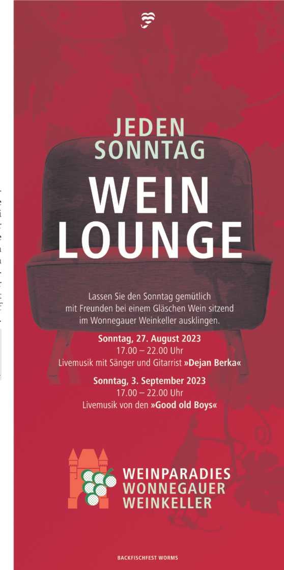 Weinkeller oder auch im Stiftskeller, welcher in diesem Jahr erstmals von der Wormser Vinothek betrieben wird. Einer der Höhepunkt für Weingenießer ist die Weinprobe „Hagens Weinschatz“ am Backfischfest-Montag im Wonnegauer Weinkeller, bei der rund 400 Weine und Sekte der heimischen Winzer verköstigt werden können. Am letzten Festsonntag lädt der Wonnegauer Weinkeller zum Jubiläum erstmals zu einem Frühschoppen mit der Musikgruppe „Die anonyme Giddarrischde“ ein. Hoch hinaus geht es auch bei den drei Riesenrad-Weinproben. Bei einem atemberaubenden Ausblick über Worms führen die Rheinhessischen Weinmajestäten fachkundig und charmant durch die Probe regionaler Weine, Seccos und Sekte. Die Buchung der Gondeln ist hier noch so lange möglich, bis alle Kontingente erschöpft sind.