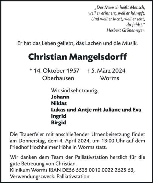 CHIFFRE-ANZEIGEN … beantworten Sie per Brief an: Nibelungen Kurier, Prinz-Carl-Anlage 20, 67547 Worms Bitte geben Sie bereits auf dem Umschlag die Chiffre-Nummer an. Wir leiten Ihr Schreiben ungeöffnet an den Adressaten weiter. Alternativ senden Sie eine E-Mail an: verlag@nibelungen-kurier.de Auskünfte sind bei Chiffre-Anzeigen nicht möglich. Verlag Nibelungen Kurier GmbH 67547 Worms · Prinz-Carl-Anlage 20 (Zugleich auch ladungsfähige Anschrift für die im Impressum genannten Verantwortlichen) Tel. 06241 9578-0 Fax 06241 9578-78 www.nibelungen-kurier.de info@nibelungen-kurier.de Auflage: 51.050 (mittwochs) 59.105 (samstags) verteilte Exemplare Kombi-Preisliste: Nr. 25/1.3.2024 Druck: VRM Druck GmbH & Co. KG 59360 Rüsselsheim Verteilung: Nibelungenland Vertriebsgesellschaft mbH Redaktion: An dieser Ausgabe haben mitgewirkt: Robert Lehr, Ina Pohl, Florian Helfert Tel. 06241 9578-25 redaktion@nibelungen-kurier.de Verantwortlich für den Anzeigenteil und den redaktionellen Inhalt Frank L. Meinel Private Anzeigen-Info: Tel. 06241 9578-0 IMPRESSUM 40. Jahrgang Wie oft soll Ihre Anzeige erscheinen? Gesamtbetrag € Anzeige soll x erscheinen + Foto € 5,– + Chiffre € 5,–Betrag liegt bar bei Bild liegt bei Bild per E-Mail gesendet an: verlag@nibelungen-kurier.de Name, Vorname Straße PLZ/Ort Telefon ! Coupon ausschneiden und in Briefumschlag an den Verlag Nibelungen Kurier GmbH, Prinz-Carl-Anlage 20, 67547 Worms, schicken. Ihre Anzeige erscheint kostenfrei auch in unserer Online-Ausgabe! Der Auftraggeber erklärt sich bereit, für Rückfragen und Leserservice vom Nibelungen Kurier angerufen zu werden. Ihr Widerrufsrecht erlischt, nach dem jeweiligen Ablauf des Anzeigenschlusstermins