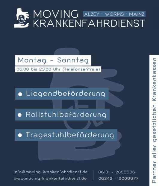 ehrenamtliche Übungsleiter/innen (m/w/d) 1–2 x wöchentlich, für 1–2 Stunden in Worms und Umgebung gegen Aufwandsentschädigung Wenn Sie Spaß an Bewegung haben und gerne eine neue Aufgabe mit Senioren übernehmen möchten, melden Sie sich in der Kreisgeschäftsstelle bei Elke Kettner unter Tel. 06241-4007 516, von Mo. bis Do. zw. 8 und 15 Uhr, oder per E-Mail an kettner@drk-worms.de Adäquate Ausbildung wird geboten.