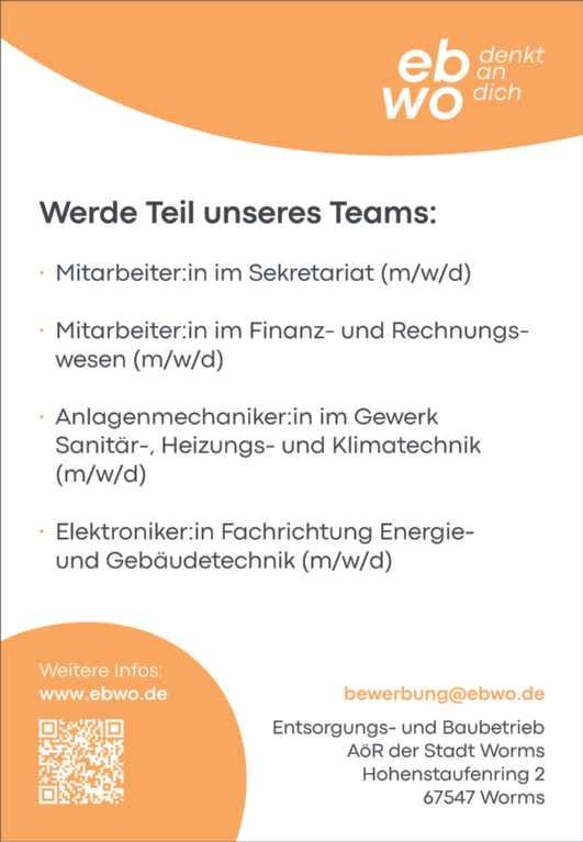 21. Woche, 40. Jahrgang, Auflage: 59.105 ExemplarePrinz-Carl-Anlage 20, 67547 Worms, Tel. (0 62 41) 95 78-0, www.nibelungen-kurier.de • Einbauservice von Kühl- und Gefriergeräten • Ceranfelder & Herdsets Wir freuen uns über Ihren Besuch! Fritz Ruff Elektro-Handels-GmbH Obermarkt 15 67547 Worms Tel. 06241 88370 info@elektroruff.de • www.elektroruff.de Ihr Haushaltsspezialist in Worms Verkauf von: – Trocknern – Waschmaschinen – Geschirrspülern – Kühl- und Gefriergeräten – Kaffeemaschinen – LCD-Farbfernseher 24_05s Foto: Pixabay.com Ute Kappes Alzeyer Straße 60 67549 Worms (neben Aral-Tankstelle) 24_21s Wir sind für Sie da! Persönlich und digital. Medikamente vorbestellen ganz einfach: WhatsApp an Reifen&AutoserviceMast Worms–Lampertheim–Lorsch www.reifenmast.de·Worms·Tel.(06241)25032 23_17s seit 1974 24_02s Wir suchen für Sie: · Einfamilienhäuser · Mehrfamilienhäuser · Eigentumswohnungen · Bauplätze · Mietwohnungen 2024 Ihr Zuhause liegt uns am Herzen! Wir an Ihrer Seite – Ihr Makler für Rheinhessen Mitglied im Immobilienverband Deutschland Wir freuen uns auf Ihren Anruf. Zuverlässiger Partner für Verkauf, Vermietung und Verwaltung Ihrer Immobilie. Neumarkt 7 • Worms • Tel. 06241 6961 WWW.DENSCHLAG.DE Sachverständige für Immobilienbewertung D2 • Desinfektion • Spezialreinigung • Geruchsneutralisierung • Tatortreinigung 23_17s 23_41s Telefon: 06241/841-1900 • www.vb-alzey-worms.de/immobilien Flörsheim-Dalsheim Großes