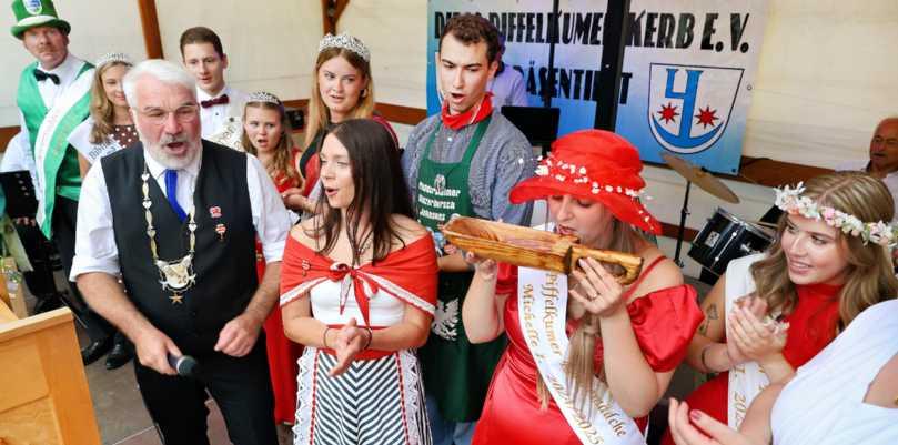 stäten und ganz besonders bei der Verabschiedung des amtierenden Kerwemädchens Ribanna I. durch Kimberly I., das Neuhauser Kerwemädchen, das rührende Worte fand, auch emotional rüber. Auch Ribanna berichtete von der schönen Zeit mit der „Wochenendfamilie“ und den neu geschlossenen Freundschaften. Oft habe man die Nacht hindurch gefeiert, die Kleidung gewechselt und sich von den IG-Mitgliedern am frühen Morgen nach Hause fahren lassen.