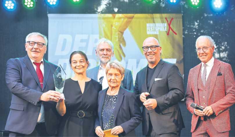 In Abwesenheit des Preisträgers vollzogen (von links) Jürgen Breier (SCHOTT AG), Petra Simon (Nibelungen-Festspiele), Prof. Dr. Jürgen Hardeck (Ministerium), Ilse Lang (Ehrenbürgerin der Stadt und Mäzenatin des Preises), Sascha Kaiser (Nibelungen-Festspiele) und Jurymitglied Prof. Dr. Dr. Karl-Rudolf Korte „das Ritual.“ Foto: Rudolf