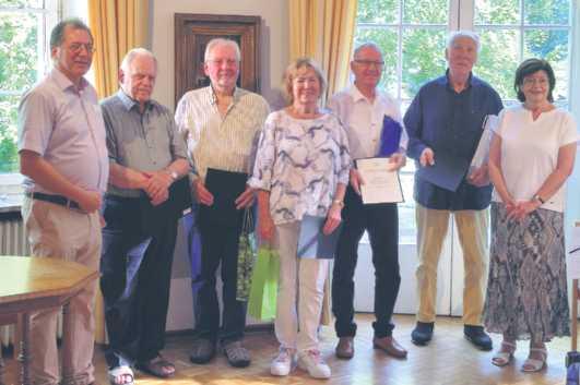 Dr. Jörg Koch (links) und Ingrid Gerster (rechts) ehren Josef Schork, Volker Brinkmann, Ursula und Horst Dreier sowie Dr. Michael Hirsch für langjährige Vereinszugehörigkeit. Foto: Bernd Braun