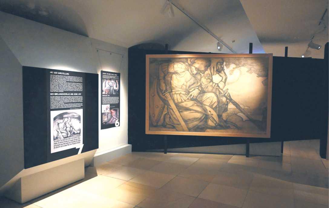 Parallel zu Biskys moderner Vision bietet die Ausstellung „Dunkle Schicksalsgewalten“ einen eindrucksvollen Blick auf die historische Darstellung der Nibelungensaga durch Karl Schmoll von Eisenwerth. Die großformatigen Vorzeichnungen, die Schmoll 1913 für seinen Nibelungen-Gemäldezyklus angefertigt hat, sind Hauptbestandteil dieser Ausstellung. Diese „Kartons“, ursprünglich für den Festsaal im Wormser Cornelianum vorgesehen, zeigen die dramatische und emotionale Tiefe der mittelalterlichen Nibelungensaga. Die düster-dramatische Darstellung der Nibelungengeschichte durch Schmoll von Eisenwerth bietet einen faszinie-