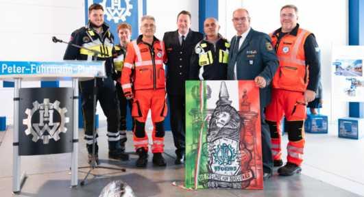 Auch die THW-Freunde vom Katastrophenschutz und der Feuerwehr aus der Region Parma waren zum Festakt angereist und hatten Peter Fuhrmann (2. von rechts) ein eigens
