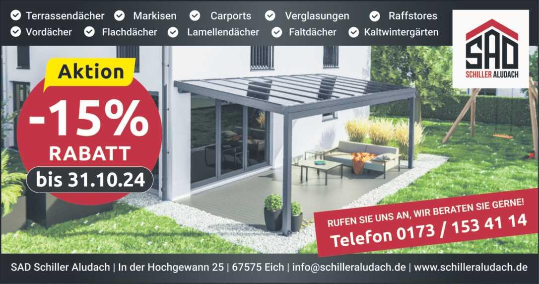 bieten wir Ihnen fantastische 20% Preisnachlass auf alle Überdachungen. Kontaktieren Sie uns für ein unverbindliches Angebot und profitieren Sie von attraktiven Rabatten. Jetzt zugreifen und sparen!