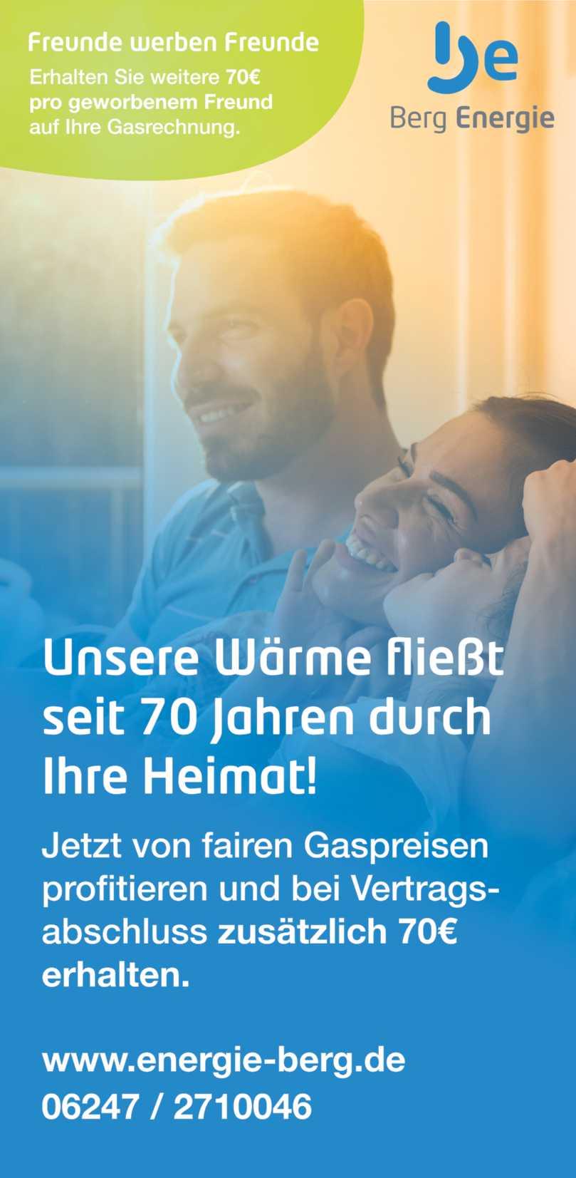 Die Berg Energie GmbH ist stark mit der Region verwurzelt und stolz darauf, diese seit bereits 70 Jahren zuverlässig mit Wärme zu versorgen. Das mittelständische Familienunternehmen mit Sitz in Worms-Pfeddersheim wird bereits in 3. Generation unter Jan Flohn geführt. Berg Energie ist ein unabhängiger Energieversorger, der im Wärmesegment seine Heimat mit Erdgas und Heizöl beliefert. Dabei legt das Unternehmen besonderen Wert darauf, sich die Nähe zu seinen Kundinnen und Kunden zu bewahren und auf deren individuelle Bedürfnisse einzugehen. Service, Qualität und Transparenz stehen dabei im Vordergrund. Der Jubiläumsbonus für Erdgaskunden
