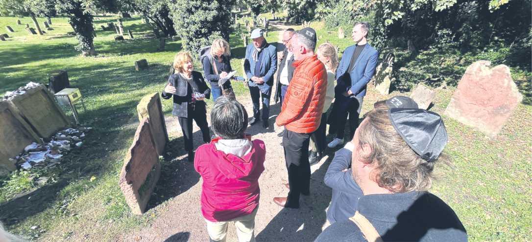 Stella Schindler-Siegreich (links) führte als ehemalige Vorsitzende der Jüdischen Gemeinde kenntnisreich über den „Heiligen Sand“. Minister Ebling (in roter Jacke) zeigte sich sehr beeindruckt von der Zusammenarbeit der SchM-Städte als „Anker für die Vermittlung des Bedeutung des Welterbes“.