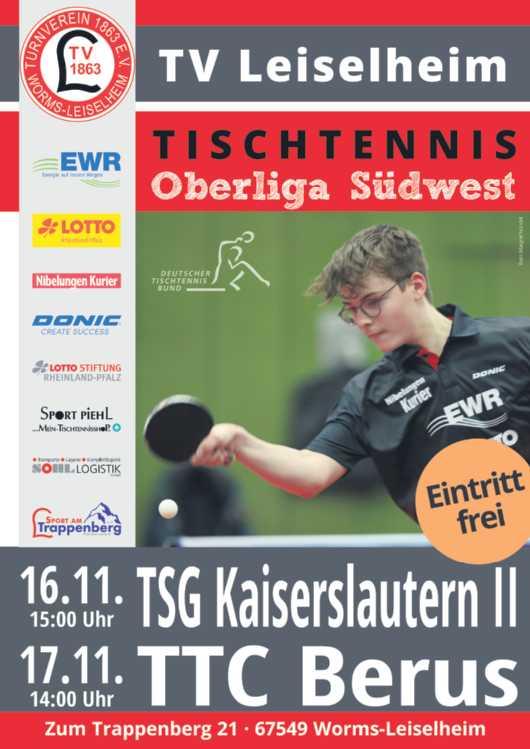 TV Leiselheim vs. TTC Berus, Sonntag, 17. November, 14 Uhr Sporthalle Zum Trappenberg 21, Worms-Leiselheim, fürs leibliche Wohl ist bestens gesorgt.