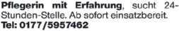 62j. herzliche Rumänin m. Deutschkenntnissen & über 20 Jahren Erfahrung i.d. Altenpflege sucht 24-Std.Betreuungsstelle mit Anmeldung. Melden Sie sich unter Telefon (01 51) 71 87 23 34