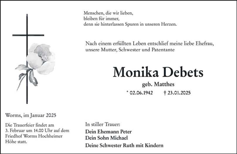 Die Beisetzung findet am 31. Januar 2025 um 9.30 Uhr auf dem Friedhof in Worms-Horchheim statt.