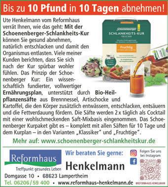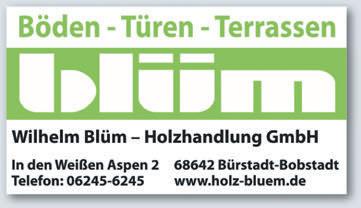 Tel.06206-945019•Fax06206-945010•zimmermann@tip-suedhessen.de WerbenauchSieerfolgreichbeiunserenSonderthemen! info@roessling-gmbh.de www.roessling-gmbh.de Wilhelmstraße8-10 68623Lampertheim Telefon+4962062905 Telefax+4962064104 DarmstädterStr.150•68647Biblis Malerbetrieb: Tel.06245/298790 FarbenFachmarkt: Tel.06245/99610 IhrkompetenterAnsprechpartnerfürBadsanierungauseinerHand Heizungsbau GmbH Heizung·Lüftung·Solar·Klima·Gas·Wasser BürstädterStraße41a·68623Lampertheim Tel.06206/4343·Fax06206/59480 BetteCuboSilhouette TISCH-,BETT-UNDFROTTIERWÄSCHE Oster-undFrühlingstischdecken weckenFrühlingsgefühle Fürein liches Zuhause Gutscheine beiuns erhältlich!