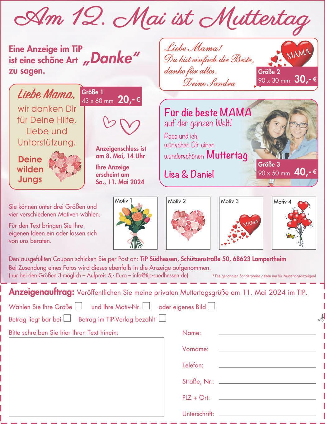 Schützenstraße50•68623Lampertheim•Tel.06206-94500•Fax06206-945010• www.tip-suedhessen.de info@tip-suedhessen.de Samstag,27.April2024·KW17·48.Jahrgang SÜDHESSEN DIEGRATISZEITUNGFÜRDASRIED