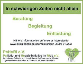 BÜRSTADT–ErneutbietetPaHoRi e.V.einenkostenfreienVortragzum ThemaPatientenverfügung,VorsorgevollmachtundSorgerechtsverfügungan.DieVeranstaltung findetam13.Septembervon17 bisca.19UhrinderGeschäftsstelle inderSchubertstraße31inBürstadt statt.Anmeldungunterinfo@ pahori.deoder06206/710203.zg